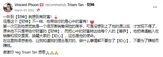第一次见他感觉是一个很厉害销售保险的高手,没想到课程后发现不止带给我财富,还把心中的财富传达给每个人!